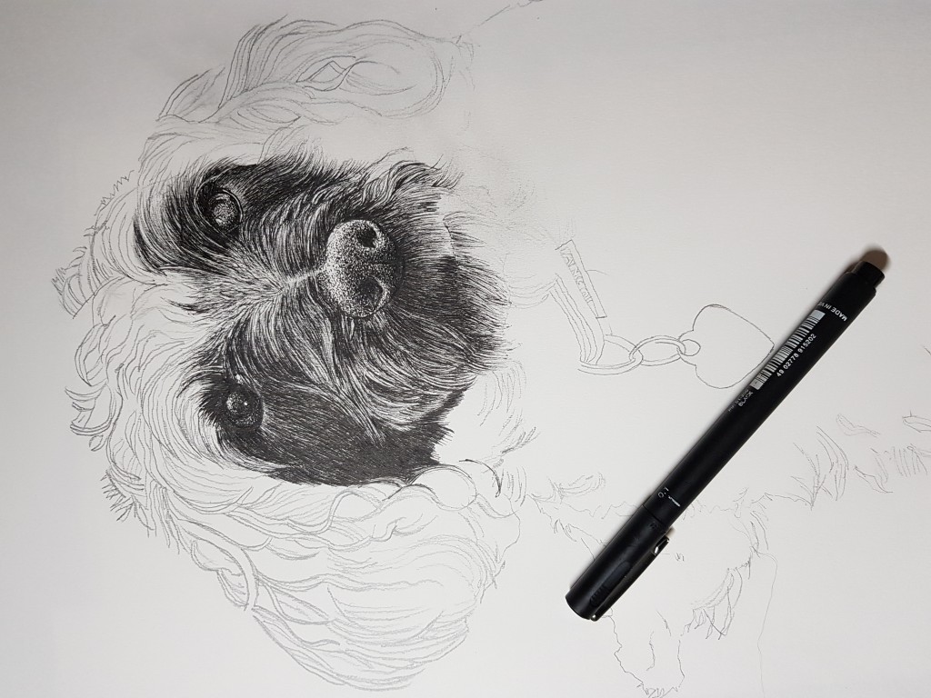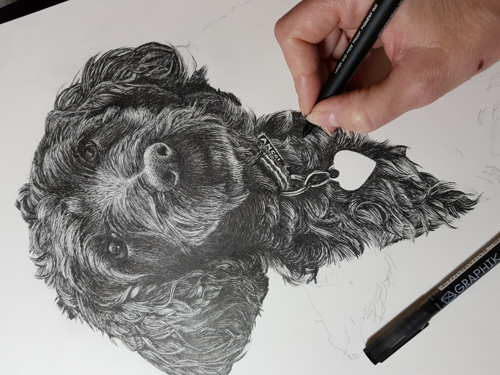 My favourite commission so far! Took me a while this one but so pleased with the finished piece. Didn't want to let her go! Drawn in black and white line using fine liners.