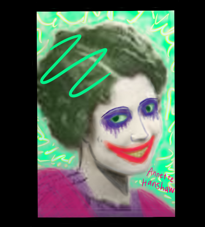 Annette Hanshaw, look her up. She is wonderful!!! Now, I think some people think I'm tryna be rude doing this whole Joker-esque vibe, PLEASE, I'm not. I like and respect Joker (mainly the Mark Hamill one). The music that Annette Hanshaw sings is one that takes me back to a time where we get that nice old soul of old timey goodness, which is what Mr Mark Hamill's portrayal of the Joker made me think of. So, making an older photo of Annette Hanshaw look like the Joker form DC comics, to me, is a cool thing. Yes, I didn't draw the entire thing, this is just me drawing over the picture. Thank you, have a wondrous day!