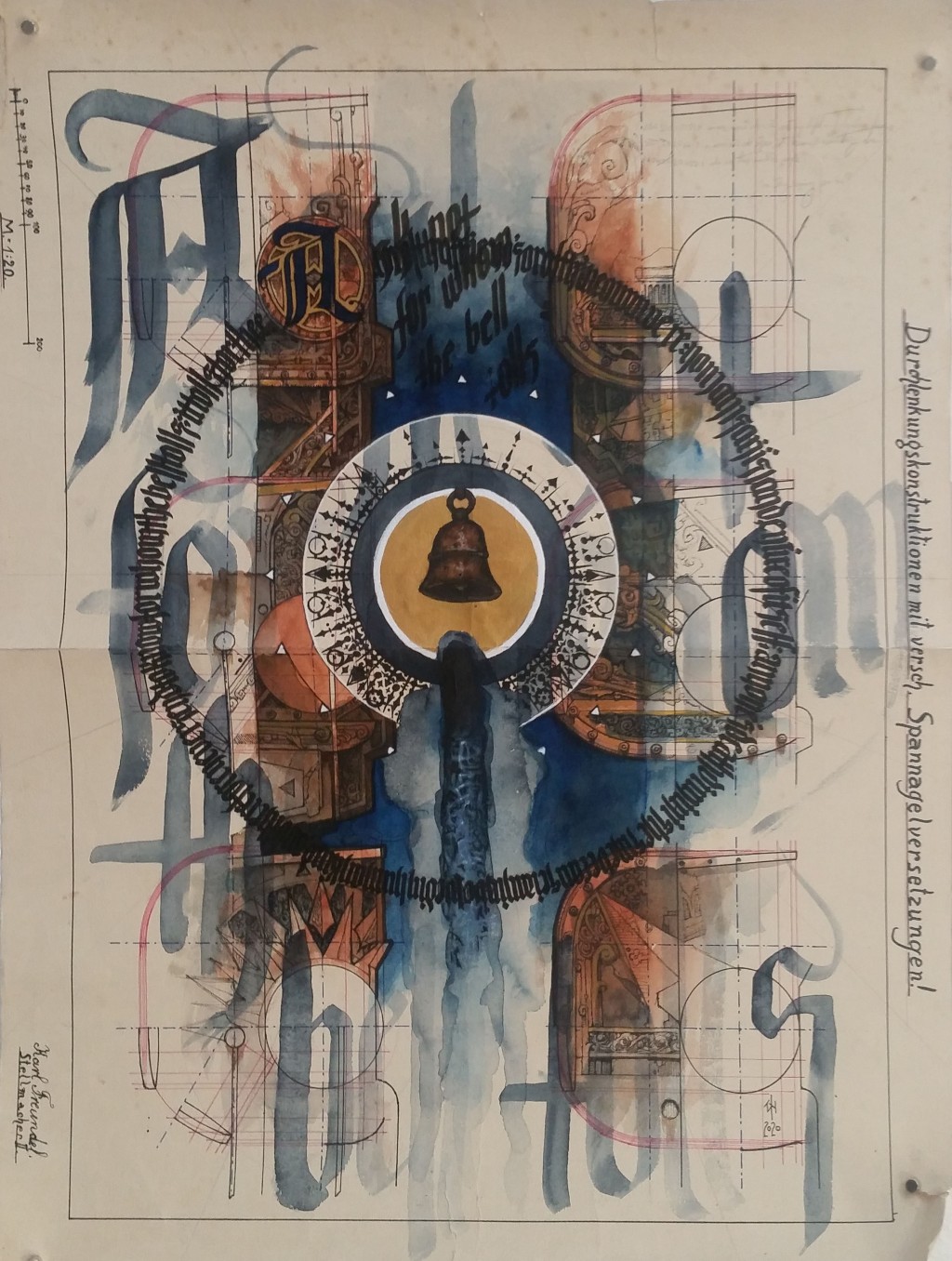 Directionless Nightmare, mixed media on 1923 engineer students drafting paper, Leipzig, 500x396mm, 2021, POA.