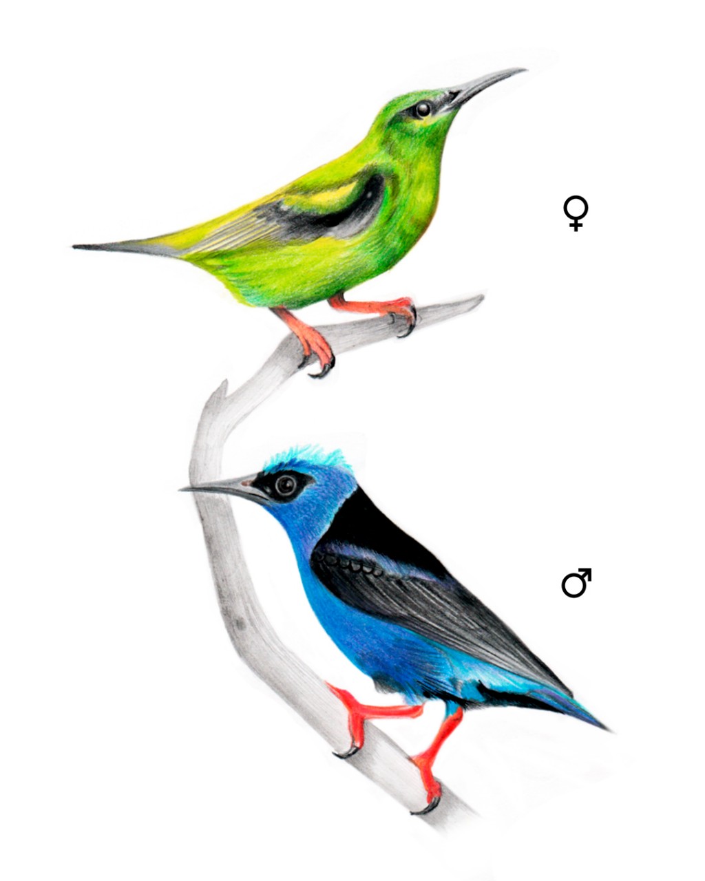 Red-legged honeycreeper, Cyanerpes cyaneus (Thraupidae), a cool generalist avian nectarivore. Colored pencils for training. More like this on: https://www.instagram.com/camilojulianc/