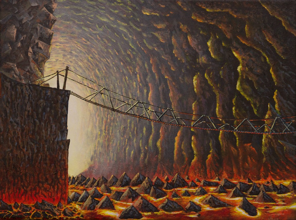 acrylic, acrylic landscape, acrylic painting, art, artwork, canvas, crossing, dangerous, fantasy, fantasy landscape, illustration, landscape, lava, painting, precarious, rope bridge, traditional art, tunnel