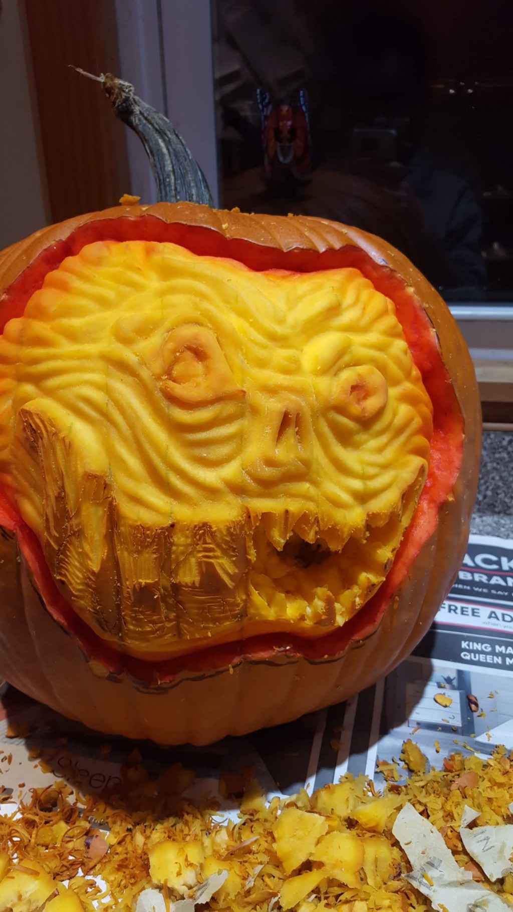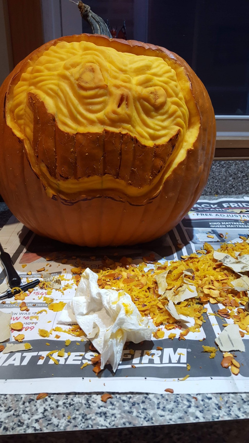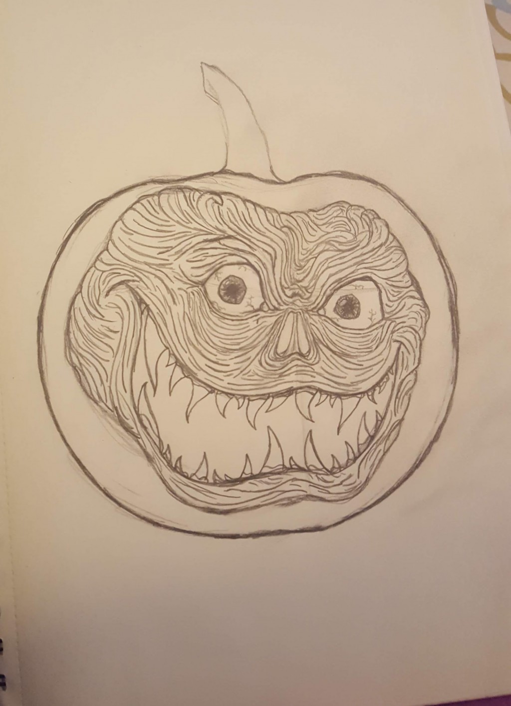 Here's the second pumpkin I carved (I did find the sketch, so I posted that in there too). Both carvings were really fun and very time consuming. I'm usually not good with 3D models or sculptures, but carving pumpkins seems to work out.