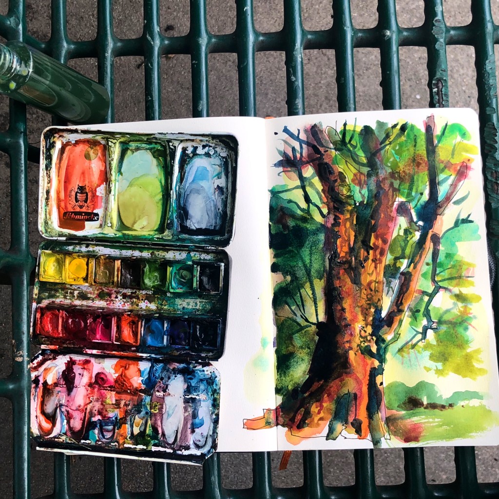 Lucky tree. Love seeing the bench and messy paints in the photo David. It helps visualize the setting of you painting this on location.