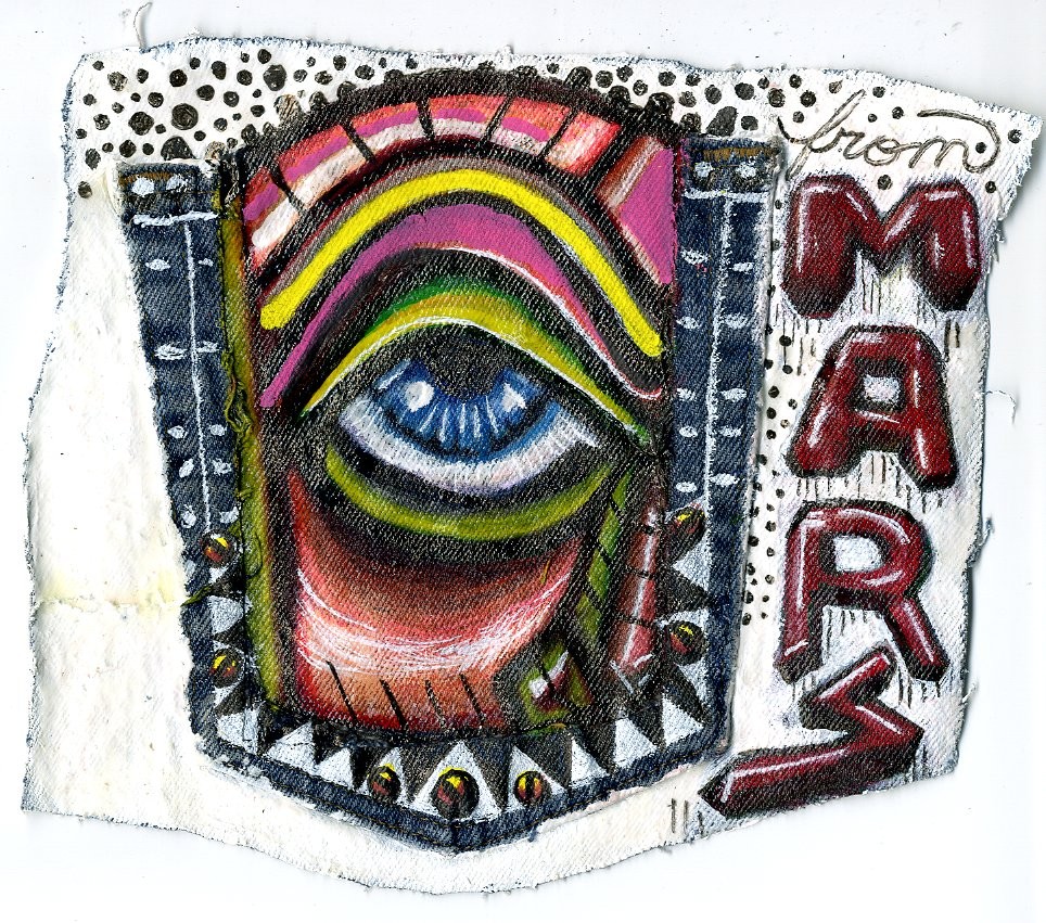 I had cut an old pair jeans up to make rags. I got bored sitting at the computer and started painting on the rag pieces.@punka