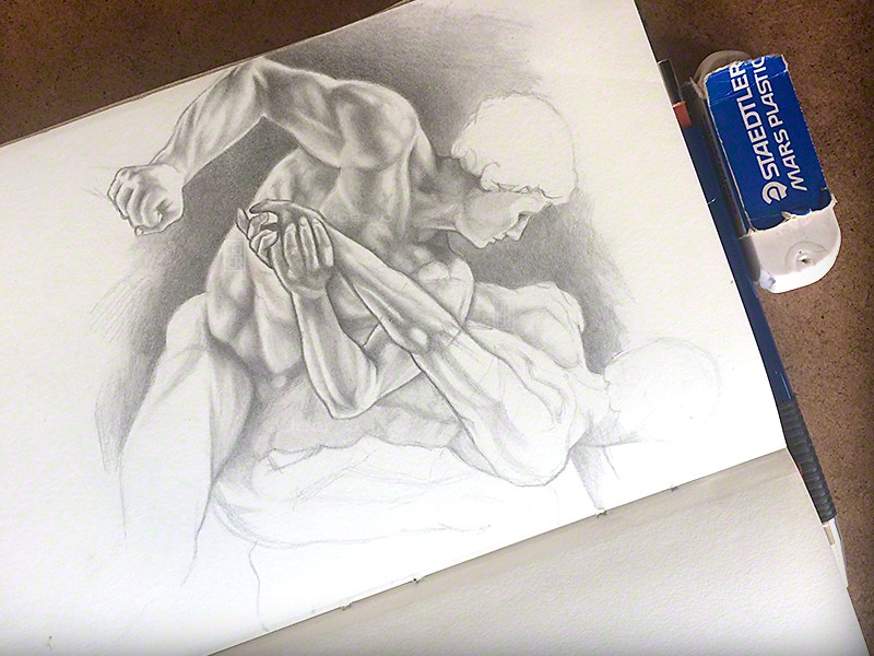 A sketchbook drawing of the classical sculpture, The Wrestlers