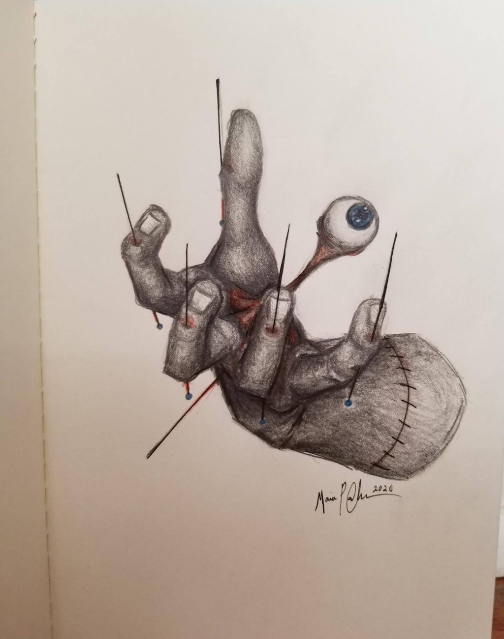 OH cool! I really hope to be able to draw hands open like this in the future and I like the idea of the needles going through the fingers.