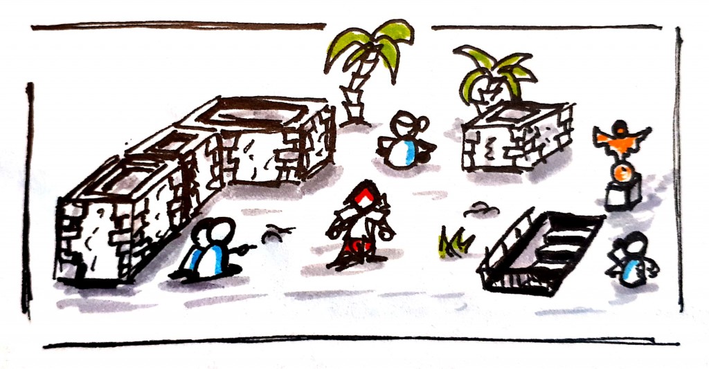 Tried to place some walls, trees, characters and further obstacles on a scene.