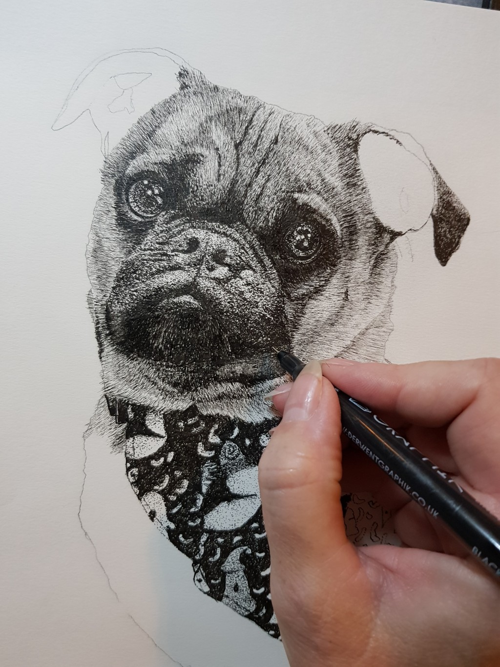 I was lucky enough to get to illustrate a beautiful Gorilla sculpture for Paignton Zoo. He took me 18 months to complete as he was under a purpose built awning at my house. Too hot and the pens dried up, too cold and my fingers froze! He now sits at the zoo and I miss him terribly! He Was decorated using acrylic markers on a white gloss base then varnished with car varnish.