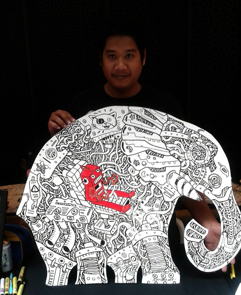 Doodle on elephant shape plywood. Robolism style.