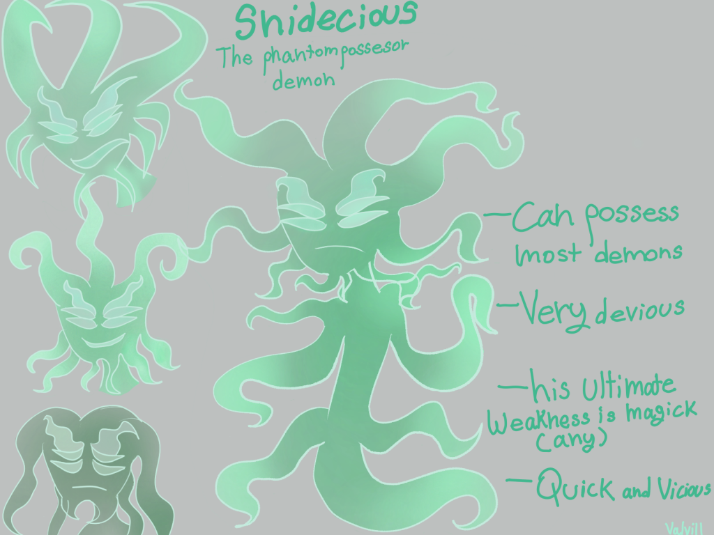 I finally drew Prince Fendren's ectoplasmic yet wicked companion,Snideacious.last time I drew him was last year and I didn't name him at all but he was still my OC.He is a low ranking phantom demon who's only purpose is to possess,kill and destroy.due to this,the rest of his kind has been wiped out entirely,making him the only possessor demon in hell,he travels throughout locations in hell.he was almost killed by many demons he tried to take control of.Fedren and him have a mutual relationship,Fedren had no desire to kill him considering snides weakness is magick he can be controlled but not mind controlled (no brain)Snide hates Fedren,often insulting him and even enjoying seeing him in pain when he is fighting a foe.Snide has possessed Fedren before,which was not only agonizing to Fedren but embarassing (being half naked inside the kingdom) since then he only posesses him for a good reason,they both go on adventures (although dangerous) in hell together,meeting new demons(usually evil) and discovering realms.(ignore my terrible handwriting)
