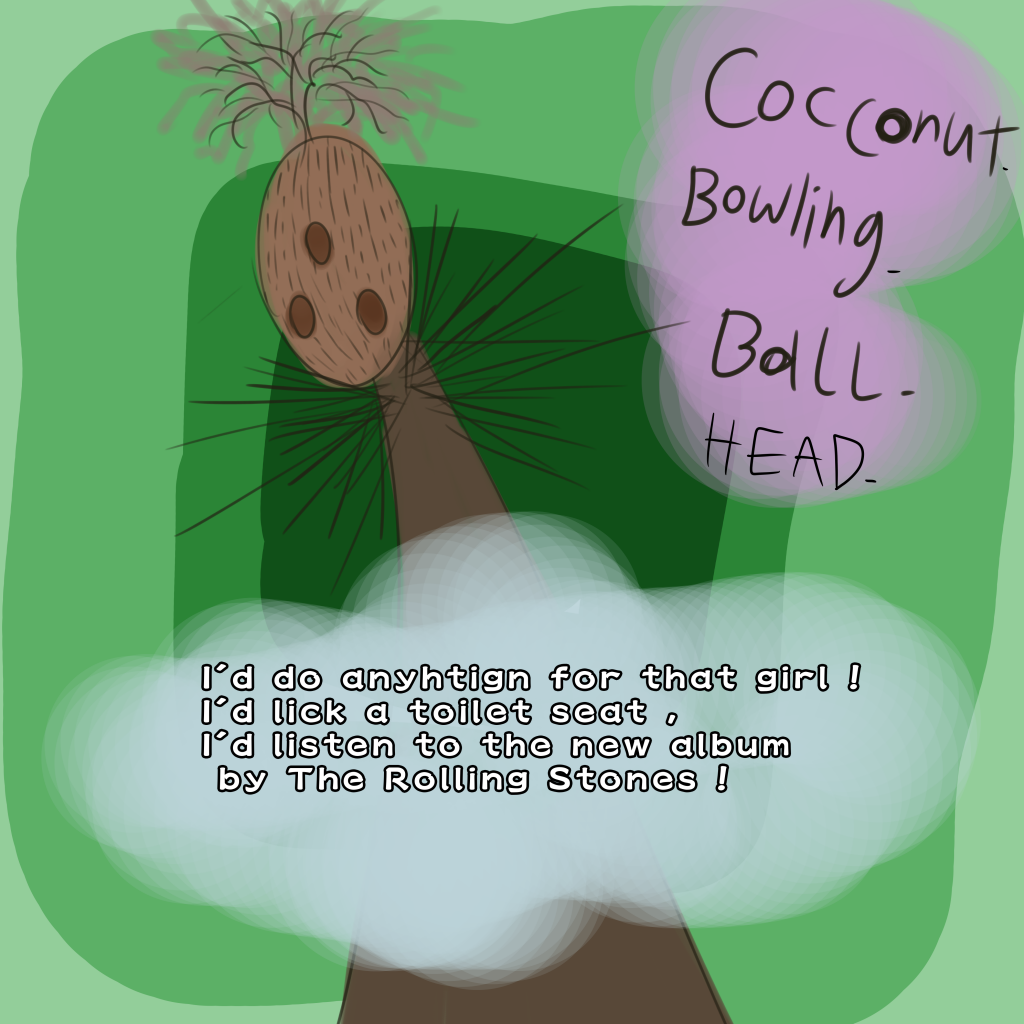 @mapalomar hahaa, literally, I got nothing against the Rolling Stones, I've heard a little of their stuff, its not bad, but its not my thing , ... I don't even know if Coconut Bowling Ball Head should even say that weird line either, I mean, I imagine that he/she/it /IDK would ever say much, it would mainly observe its few friends and maybe break out one day with this , I'm not sure ... But, yo, glad you enjoy it! thank you so much! And have a wonderful day !