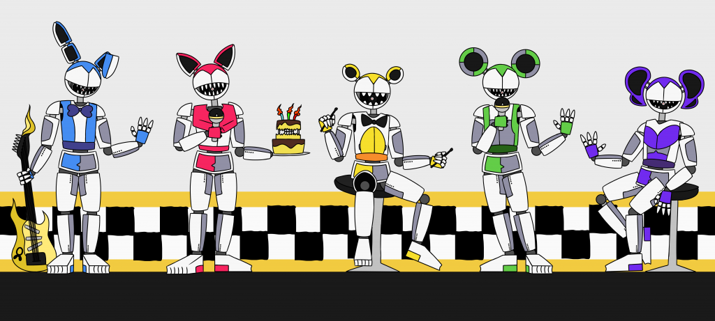 Happy Thanksgiving, everyone! Here are five of the shorter animatronics, which take up the main stage! There are three sections of the stage, like the Rock-afire Explosion's original stage! The animatronics are all different animals, like usual. They even have different teeth! The first animatronic's name is Preistor, and he's the blue rabbit. He plays guitar. Then we have Elizabeth, a hot-pink cat, and she's the female singer. Then we have Altor, a yellow bear. He plays the drums. Then we've got Bruce, a green mouse, who's the male singer. Finally, we have Lexibo, a purple elephant. She plays the piano. They were created by Jester (Dellusion was created by Jester, too) for entertainment. Unlike FNaF, there are no dead kids possesing these guys. At least, none relating with Jester and his crew. Actually, they're vessels for lost spirits! They've been specifically engineered for lost souls to posses them. However, in the day, they act wonderfully for entertainment. Don't be frightened by the absence of eyes! They're always watching with those little cameras in their mouths. These guys, including Jester and Dellusion, were inspired by the funtime animatronics from FNaF SL. Drawn with FireAlpaca. More are coming!