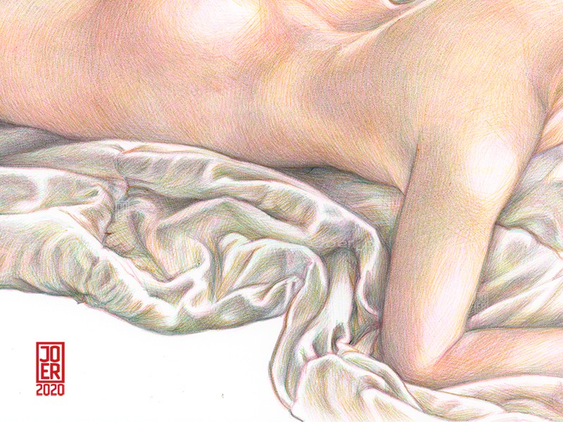 Model Ruth resting on a platform covered by red bed sheets. Bic4 Ballpoint Pen on Archival 9” x 12” paper.