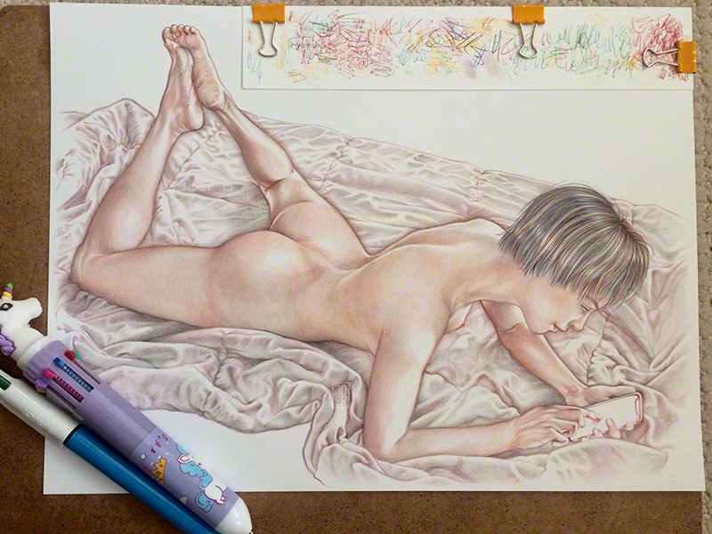Drawing in a single direction instead of using back-and-forth movement alleviates some of the blotching that happens when using ballpoint pens. The back-and-forth method usually deposits the gunk that builds up on the tip of the ballpoint, smearing them in unexpected and unfortunate places on the drawing. When using the back-and-forth method, I usually have a napkin handy in order to clean the tip of the pen. Model: Meadhbh (Maeve)
