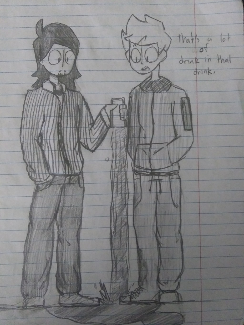 I did this sketch a while ago, but it still holds up. These two (Richard Dixon left, Asher Dixon right) are brothers, who have two very well-off parents. They live in a five story mansion, but still go to a public school because of where they live. They're both blond, but Richard dyes his hair purple.