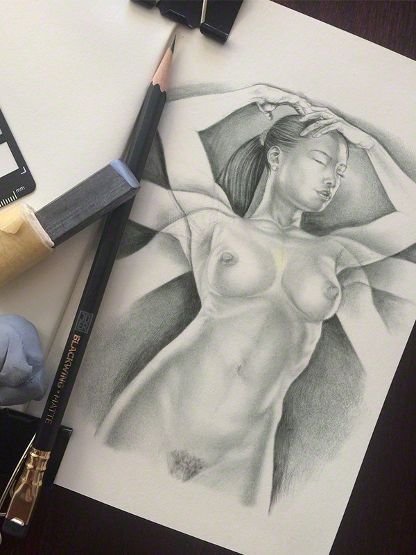 Sketch of Amy with various arm positions. A preliminary Moleskine sketchbook work-up for a future full-sized illustration. 2B Pencil, Soft Charcoal Pencil on 5.5” x 8.25” Moleskine sketchbook. Model: Amy_D