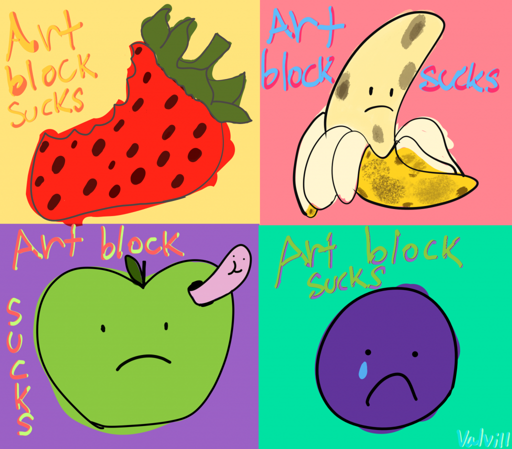 I really,really hate having an art block because most of the times you have several drawing ideas,only to have trouble choosing one and not drawing anything at all!The strawberry one has no face because it was either ripped out or eaten.I originally wanted to draw four Gucci logos with different fruits,but since having an art block ruined it,I made this.I might take a break from drawing for,I don't know,10,000 years or so.