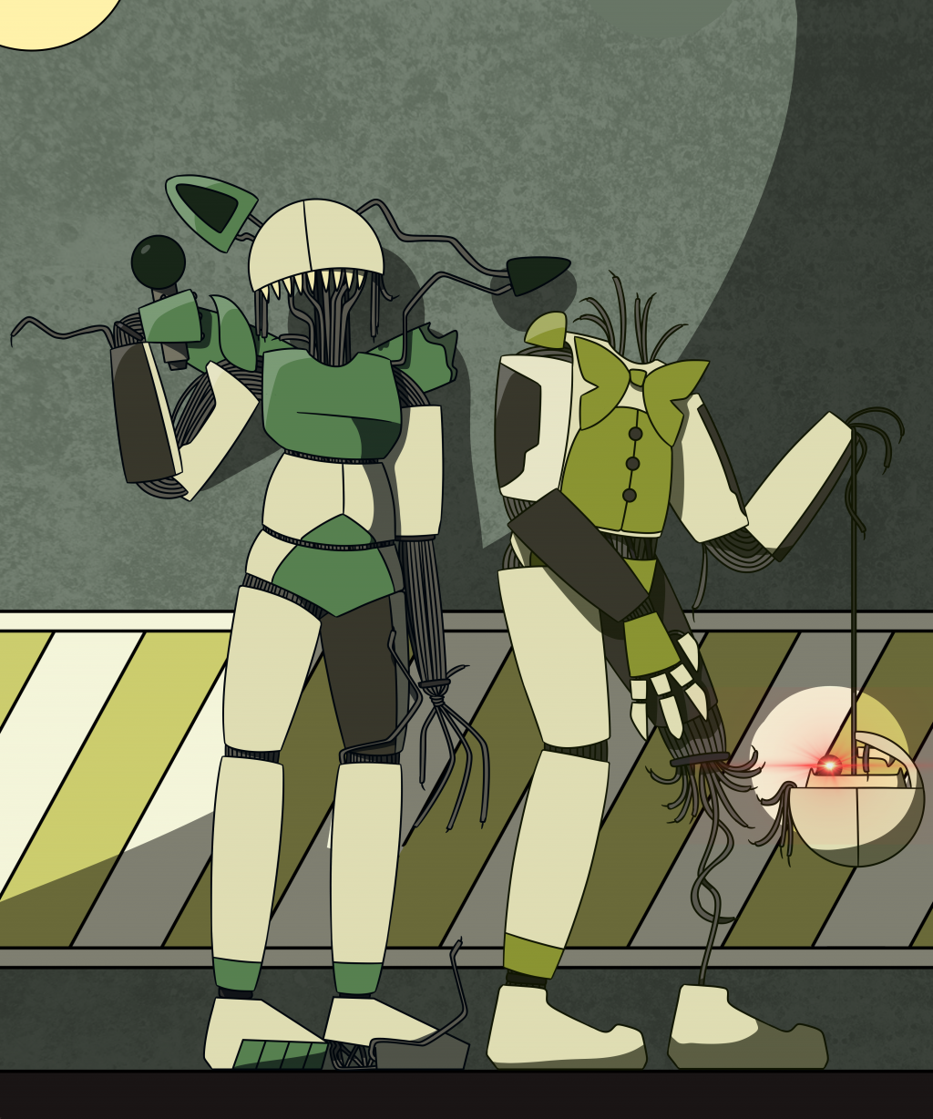 Some more stylized withered versions of the Altitone band members, Elizabeth (on the left) and Altor (on the right). Elizabeth has ears but no cameras (which are usually located somewhere on the head (look at stylized withered Preistor for context)), so she is blind. Altor has no ears but a camera (which has been broken off and now sits loose in Altor's disembodied head), so he's deaf. Before version 2 of these guys, Preistor was maroon (once again, look at stylized withered Preistor for context), Elizabeth was teal, and Altor was yellow-green (mostly yellow). They roam the halls in Jester's workshop. Drawn with FireAlpaca.