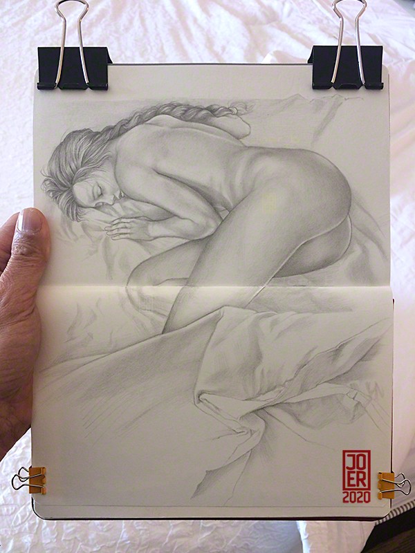 A little bit of an issue with the foreshortening of the figure. Model: Meadhbh (Maeve) 2B Pencil, Soft Charcoal Pencil on 5.5” x 8.25” Moleskine sketchbook.