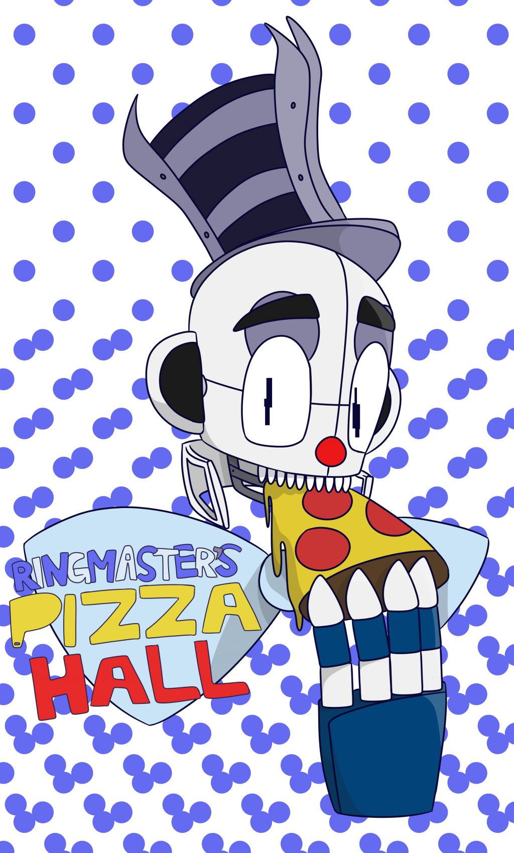Kind of the icon or logo of Jester's restaurant, "Ringmaster's Pizza Hall". Before it was known as such, we called it "Jester's Mini Jamboree". If you didn't know, Jester has a line of steel dividing his bottom left and bottom right faceplate, which forms one mouth. So, in order to eat (even though Jester CAN'T eat, because he's a robot), he'd need to open those faceplates so he can fit food through the mouth. Drawn with FireAlpaca.