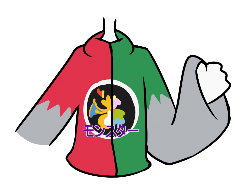 A Pokémon sweater I drew a while ago. It represents Japanese Pokémon Red and Green. I drew a static-head wearing a smiliar sweater, which is inspired from this. The Japanese text translates to "Monster". Drawn with FireAlpaca.