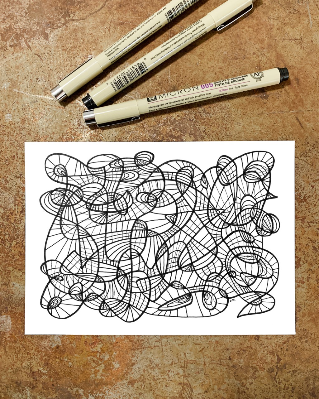“Whirlwind 3”, an original drawing. Micron pens on archival paper. Size: 5” x 7”. Title, signature and date in the back of the drawing. This drawing is the 3rd in a series of drawings that were posted over a period of 100 days. The original post date on this drawing was September 3, 2020.