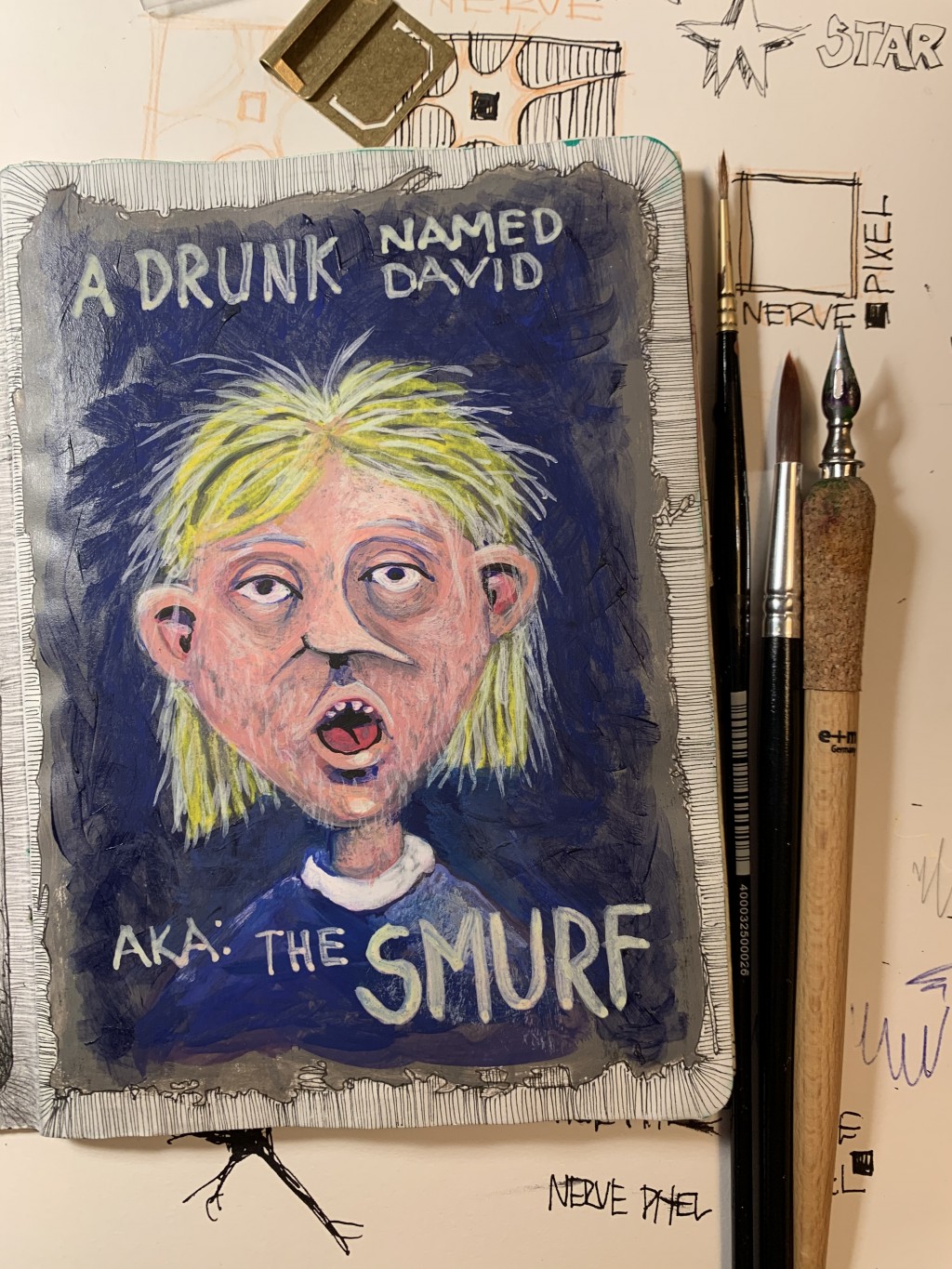real guy. drawn from memory. i was not drunk. gouache and acrylics ... a page in brooklyn art library sketchbook long overdue for submitting