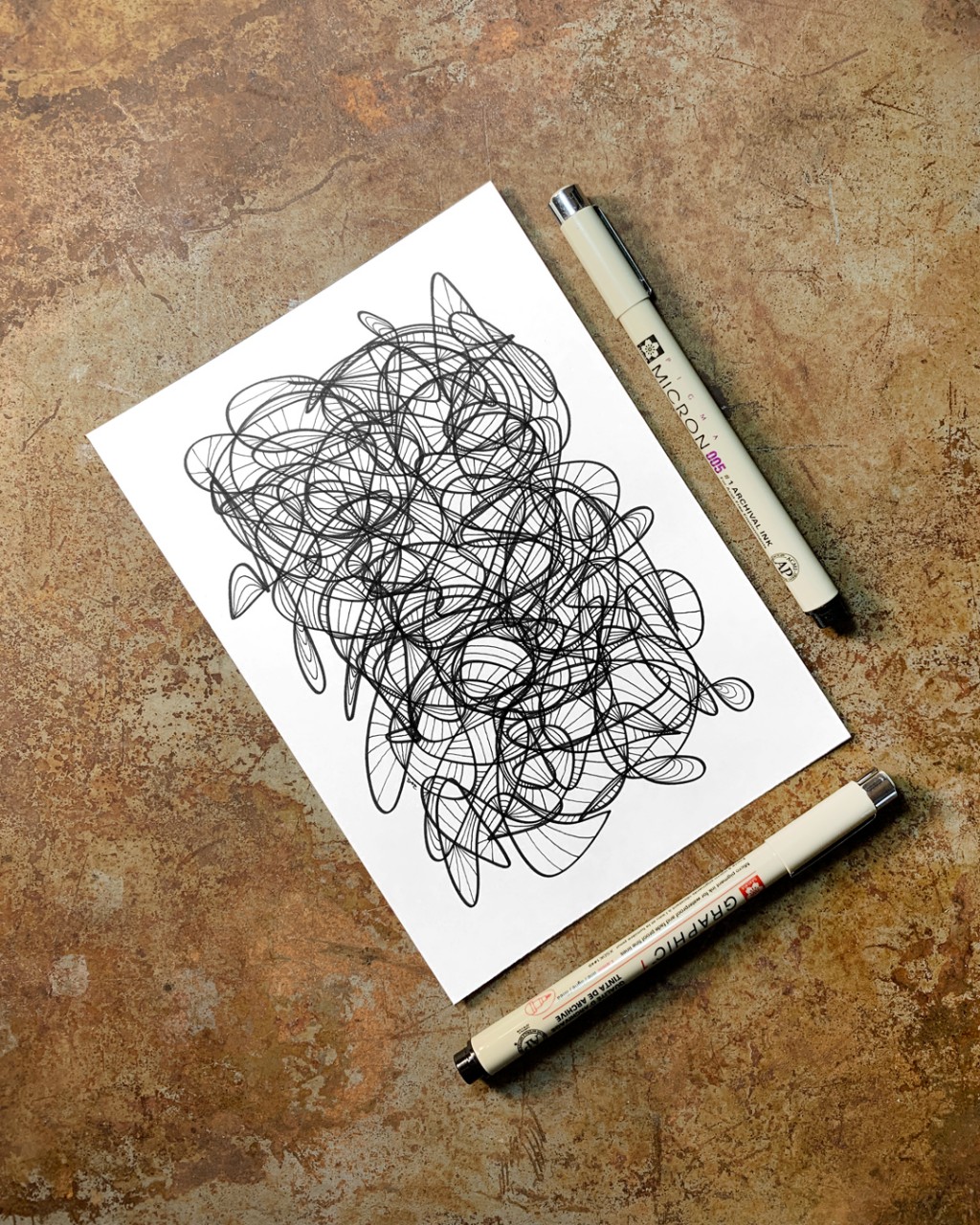 "Whirlwind 13”, an original drawing. Micron pens on archival paper. Size: 5” x 7”. Title, signature, and date in the back of the drawing. This drawing is the 13th in a series of drawings posted over a period of 100 days. The original post date on this drawing was September 13, 2020.