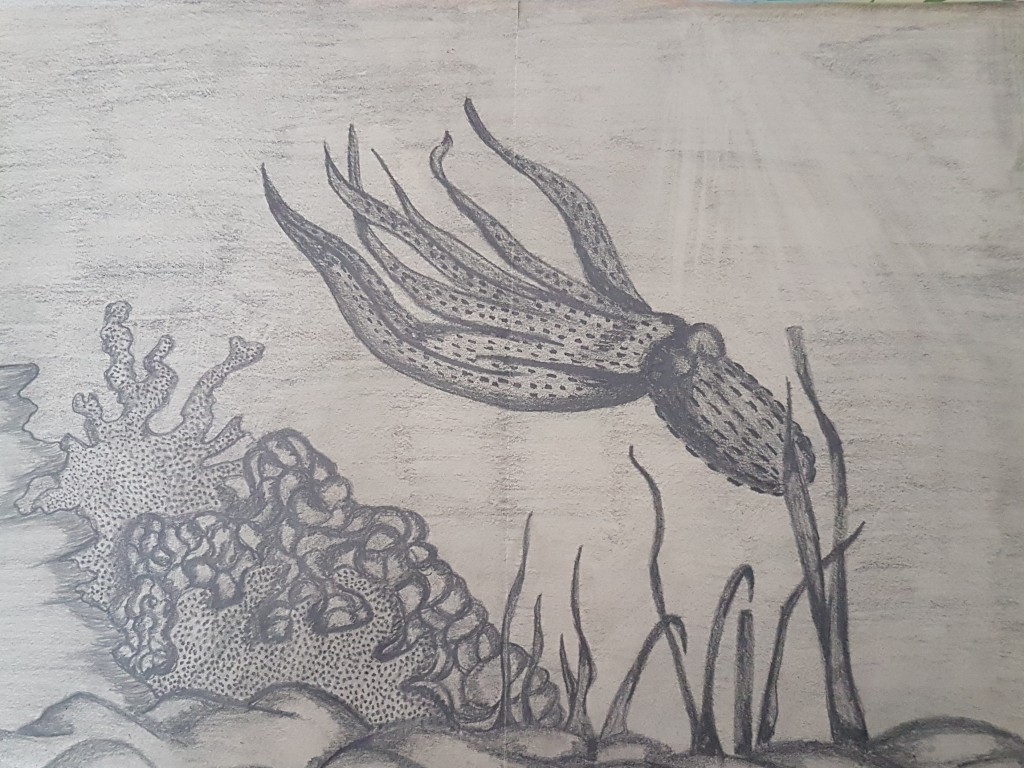 ...supported by some bioluminescent particles. I drew the glowy effect with a merchandise neon orange pastel pencil that I probably stole somewhere. The rest is a simple black fineliner on drawing paper.