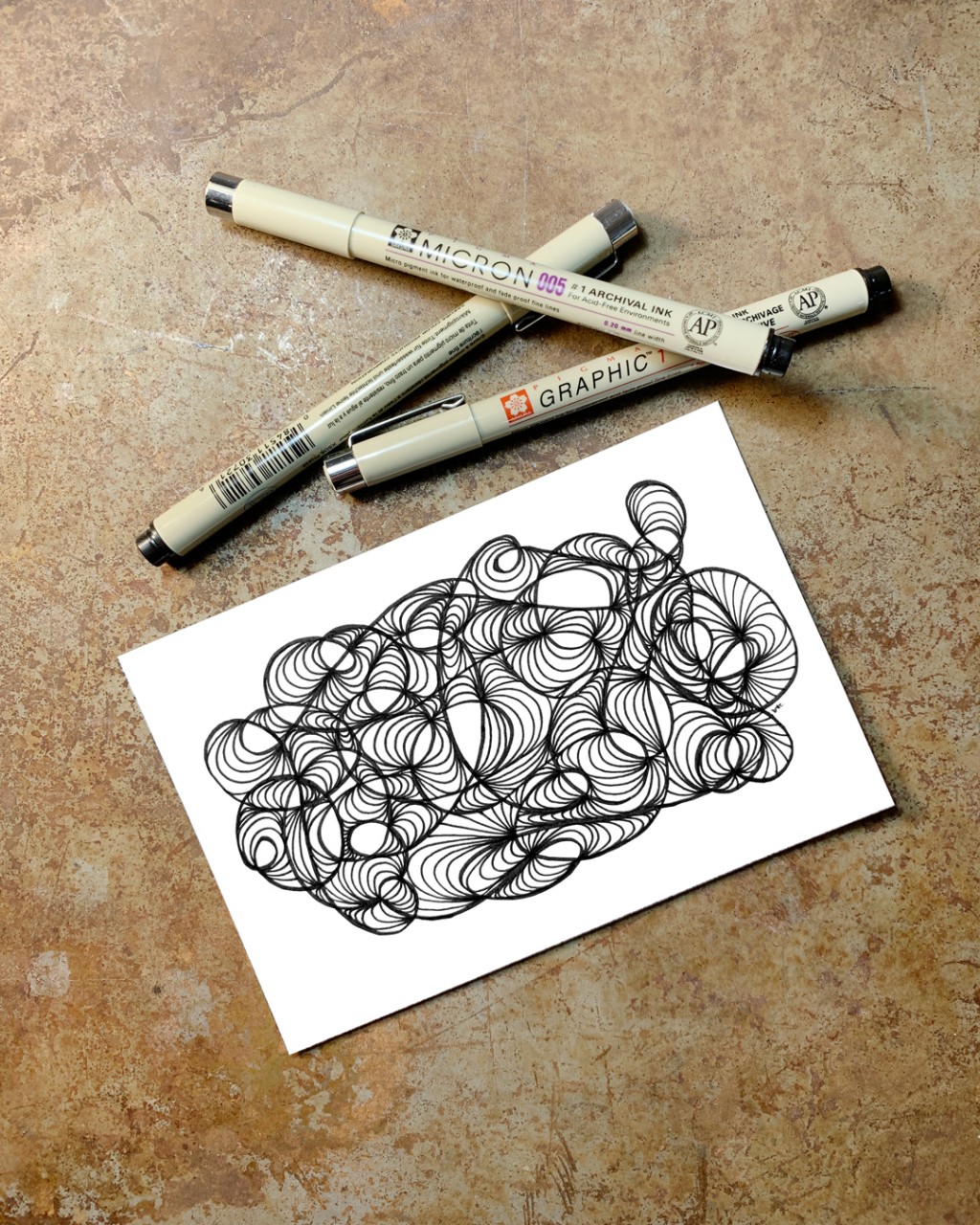 "Whirlwind 16”, an original drawing. Micron pens on archival paper. Size: 4” x 6”. Title, signature, and date in the back of the drawing. This drawing is the 16th in a series of drawings posted over a period of 100 days. The original post date on this drawing was September 16, 2020.