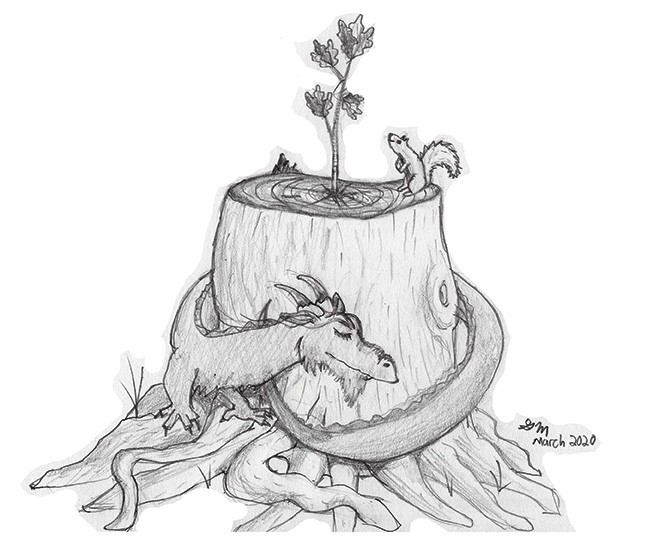 I actually saw this on a walk one day...minus the dragon. A new tree was growing from the center of a stump. Nature is awesome.