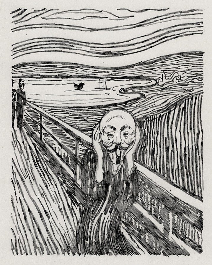 The Fawkes Scream, after Munch. Some anonymous dude on a bridge of spies.