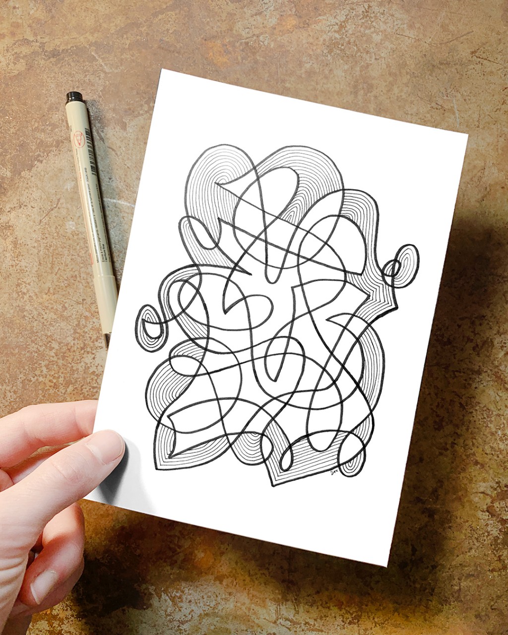 "Whirlwind 18”, an original drawing. Micron pens on archival paper. Size: 5” x 7”. Title, signature, and date in the back of the drawing. This drawing is the 18th in a series of drawings posted over a period of 100 days. The original post date on this drawing was September 18, 2020.