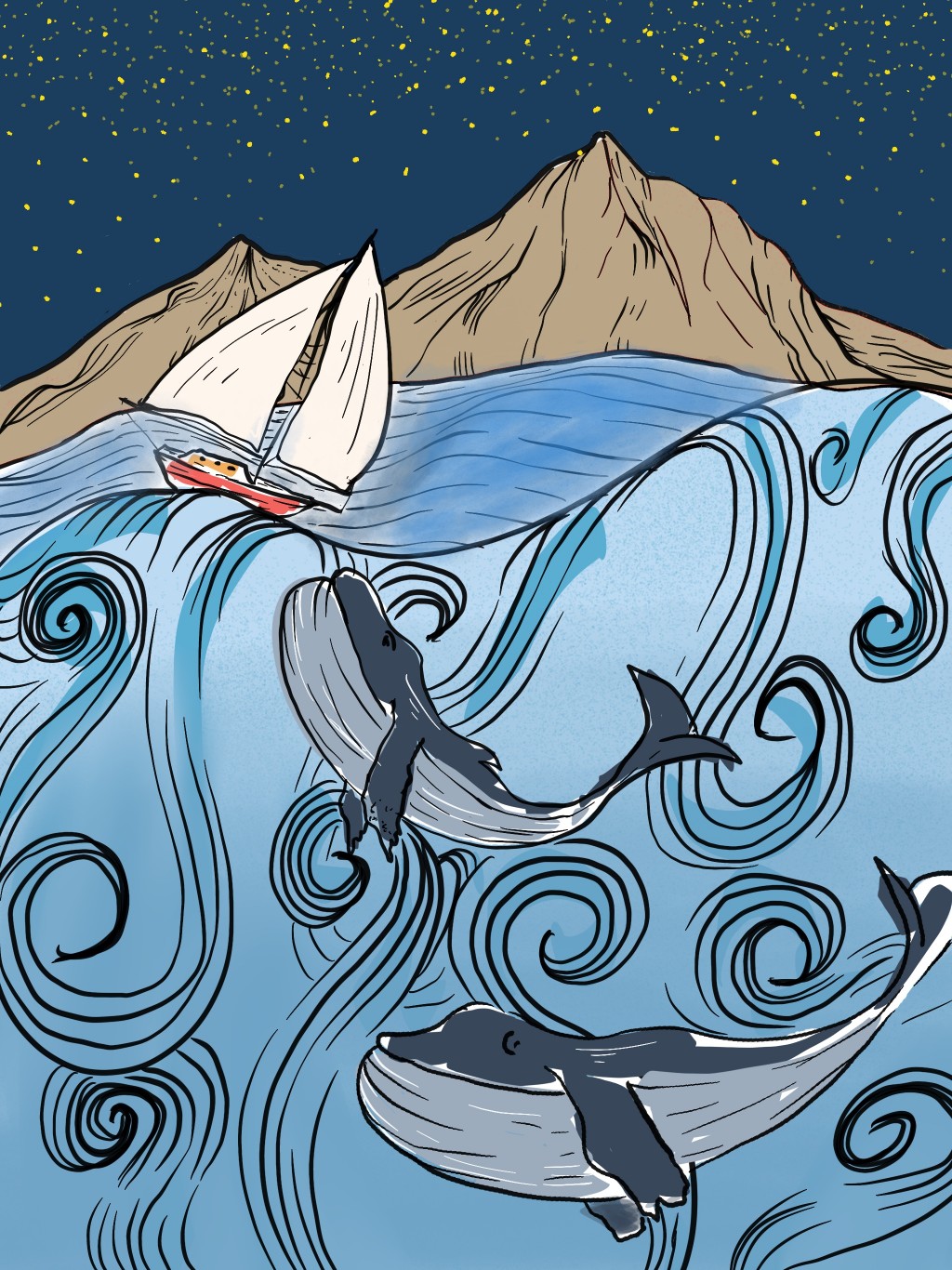boat, digital art, drawn, illustration, marine, mountains, nature, nautical, ocean, sea, sea life, whale