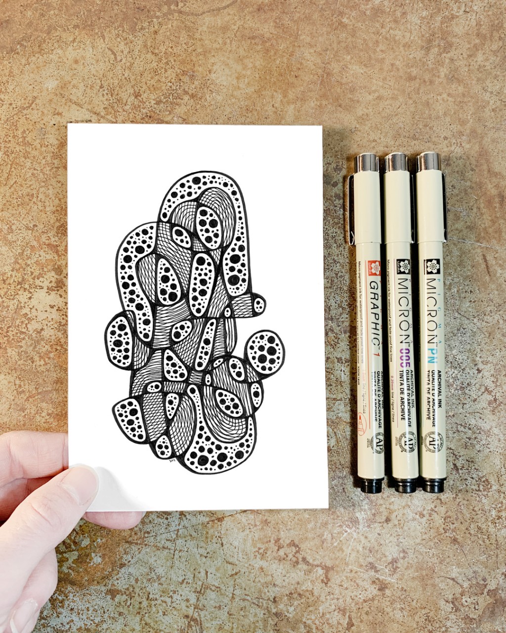 "Whirlwind 22”, an original drawing. Micron pens on archival paper. Size: 4” x 6”. Title, signature, and date in the back of the drawing. This drawing is the 22nd in a series of drawings posted over a period of 100 days. The original post date on this drawing was September 22, 2020.