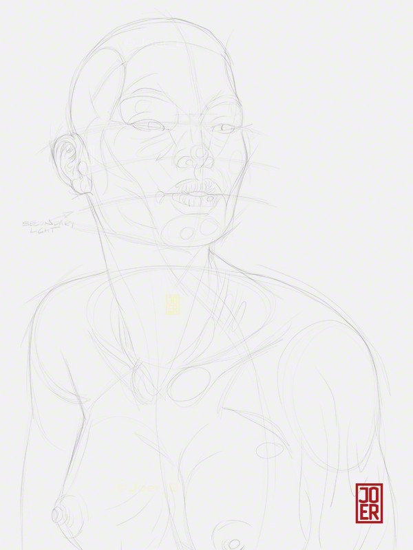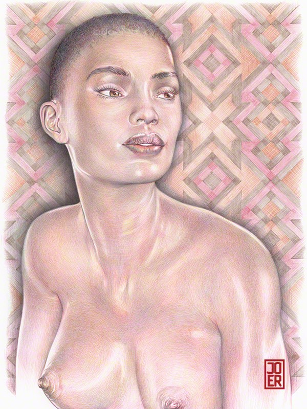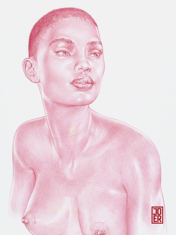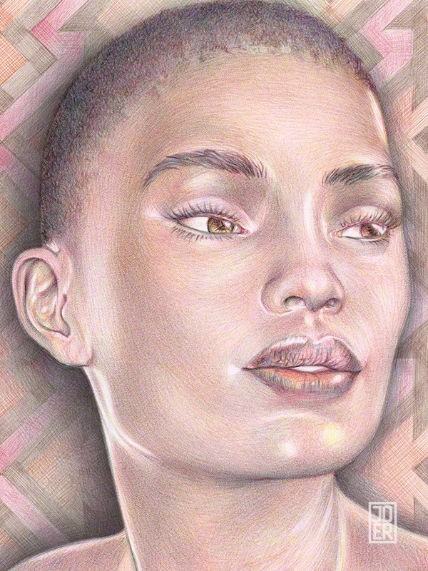 This drawing has gone through several iterations (rough napkin sketch, sketchbook sketch, black and white version, limited colour version). 2021, Bic4 Ballpoint Pen, Novelty 10 Colour Ballpoint Pen on 9” x 12” Archival paper. Model: ImaniZ