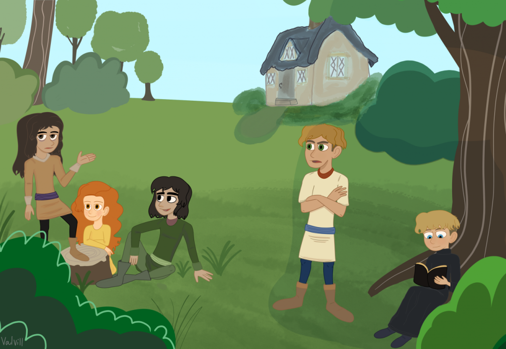 Mortal Elvarelyn is telling Erik & Abigail about her life when she was an Alceridian demon before Qasaherim exiled her whilst Bernard scowls at them at the same moment when Gerard is reading the Bible.this is actually the first drawing I worked on CSP but it took me weeks to finally finish the background since im not too keen on drawing them.I even drew a house (it's the first time in years actually)it looks shabby but then again lots of peasant houses were shabby and small.