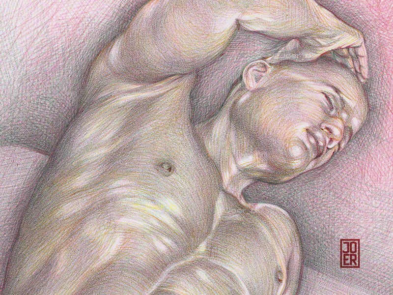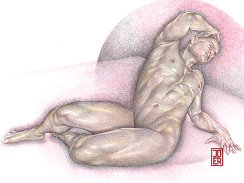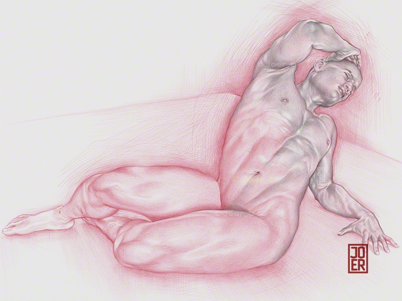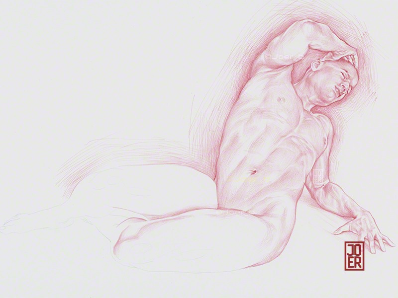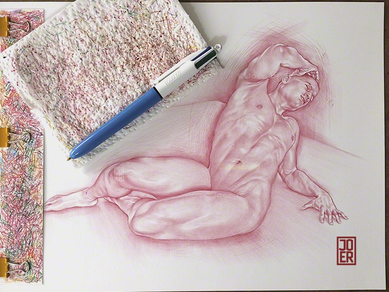 Malik straining to keep the twisting pose. Decided to leave this one as a slightly rough red Bic pen sketch for now. There’s something to be said about the energy found in the work-up drawing.
