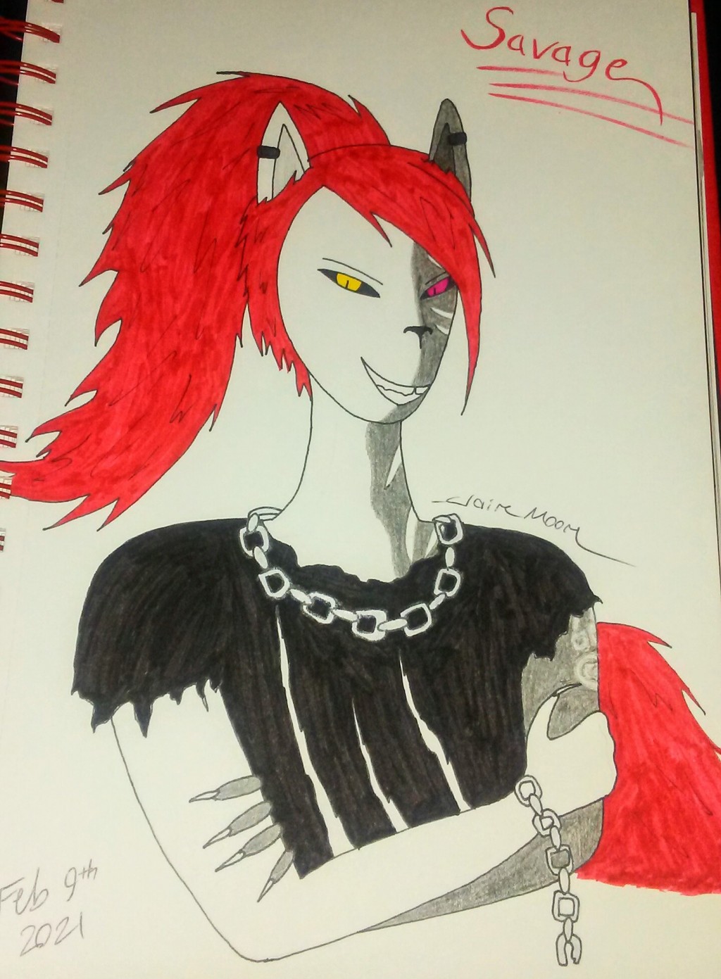 This is a drawing colored with crayons and brush pens. His colors and appearance was inspired by a wolf avatar I created on an app. I completely transformed the likeness of my wolf avatar and made him half human.