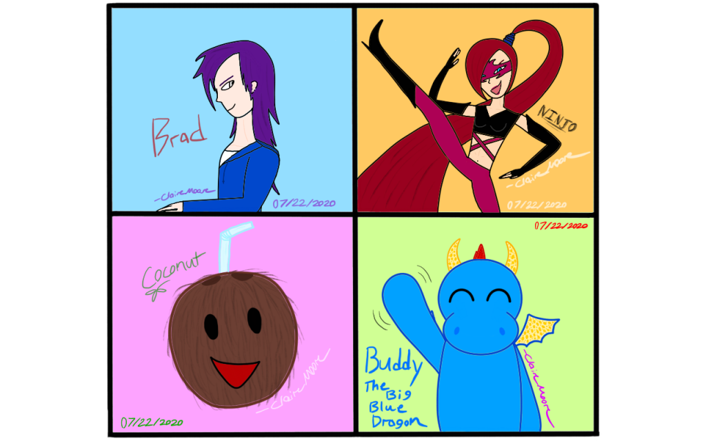 This is a digital drawing of four random characters. The two on the left were totally spontaneous -- meaning they didn't exist until this picture was drawn. Buddy (on the right bottom corner) is one of my recent creations and he's developed into a very loveable character. Ninjo, I've actually known for a long time. She's a crazy gal -- always chopping stuff and crashing through ceilings. Come to think of it.. she's not really like a ninja at all..! The whole purpose of this drawing was to showcase my skill areas. I'm skilled in people (both male and female), animals, and even inanimate objects.