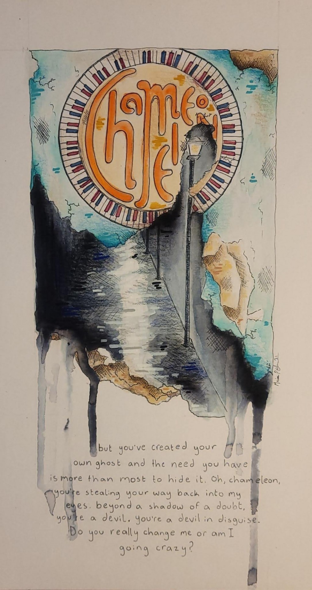 "Chameleon, you're free again, my child." I think using song lyrics may be slightly cheating...but it is quoted text... I feel like I haven't made a 'purposeful' piece in a bit, so this drawing felt even better to make. There have been multiple ups and downs lately. Frustration, self-hate, and anxiety can take many forms, and eventually I lose sight of what they started as. I heard this song for the first time a few months ago and it's really been stuck in my head recently for various reasons. I don't know, sometimes music provides an escape that even art can't.