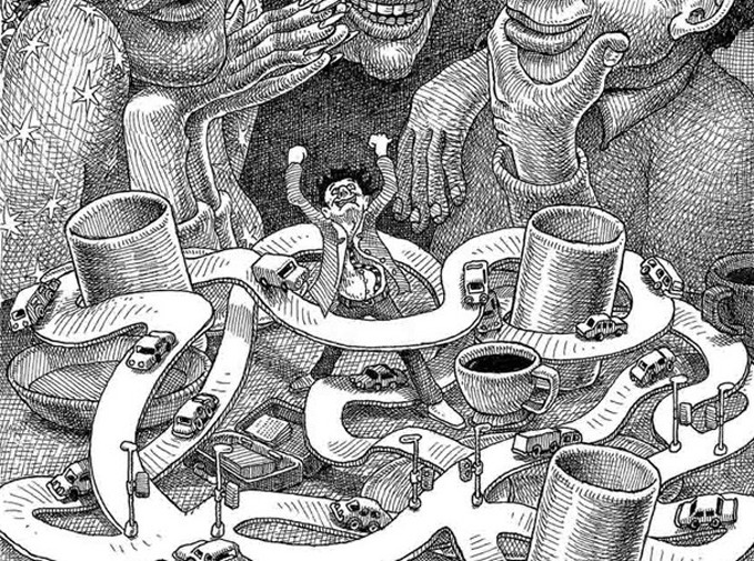 Part of an illustration where city authorities conspire to build roadways that will only get people killed.