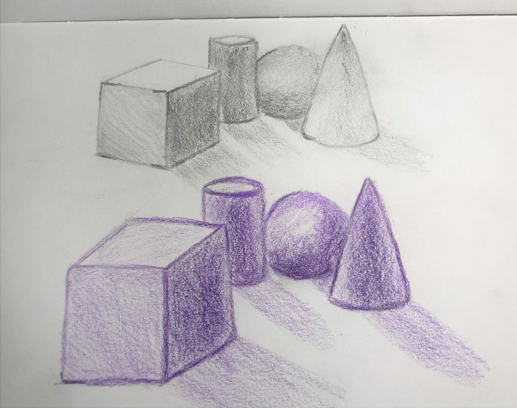 My shape drawings are done from references of other shape drawings but objects like the pitcher drawing were done from an actual photograph of a pitcher. I don't have that great of a set up to create my own still life's at the moment. :3