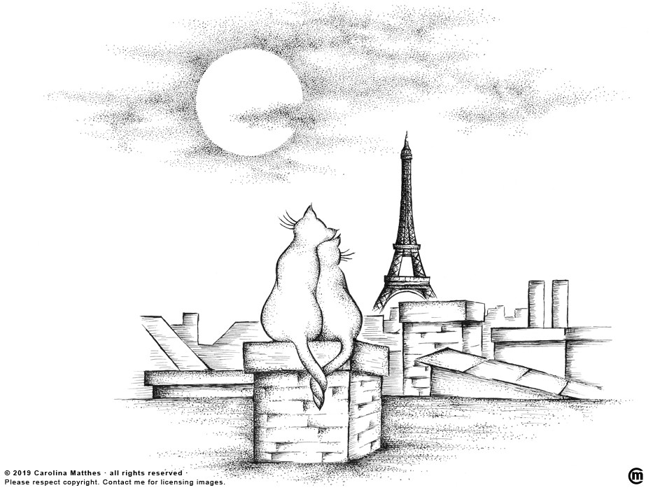animals, blackwhite, bohemian, cats, couple, drawing, fashionable, illustration, inking, inkpen, kitty, love, lovecats, moggies, moon, moonlight, night, paris, pointillism, romantic, snuggle, trendy, vintage