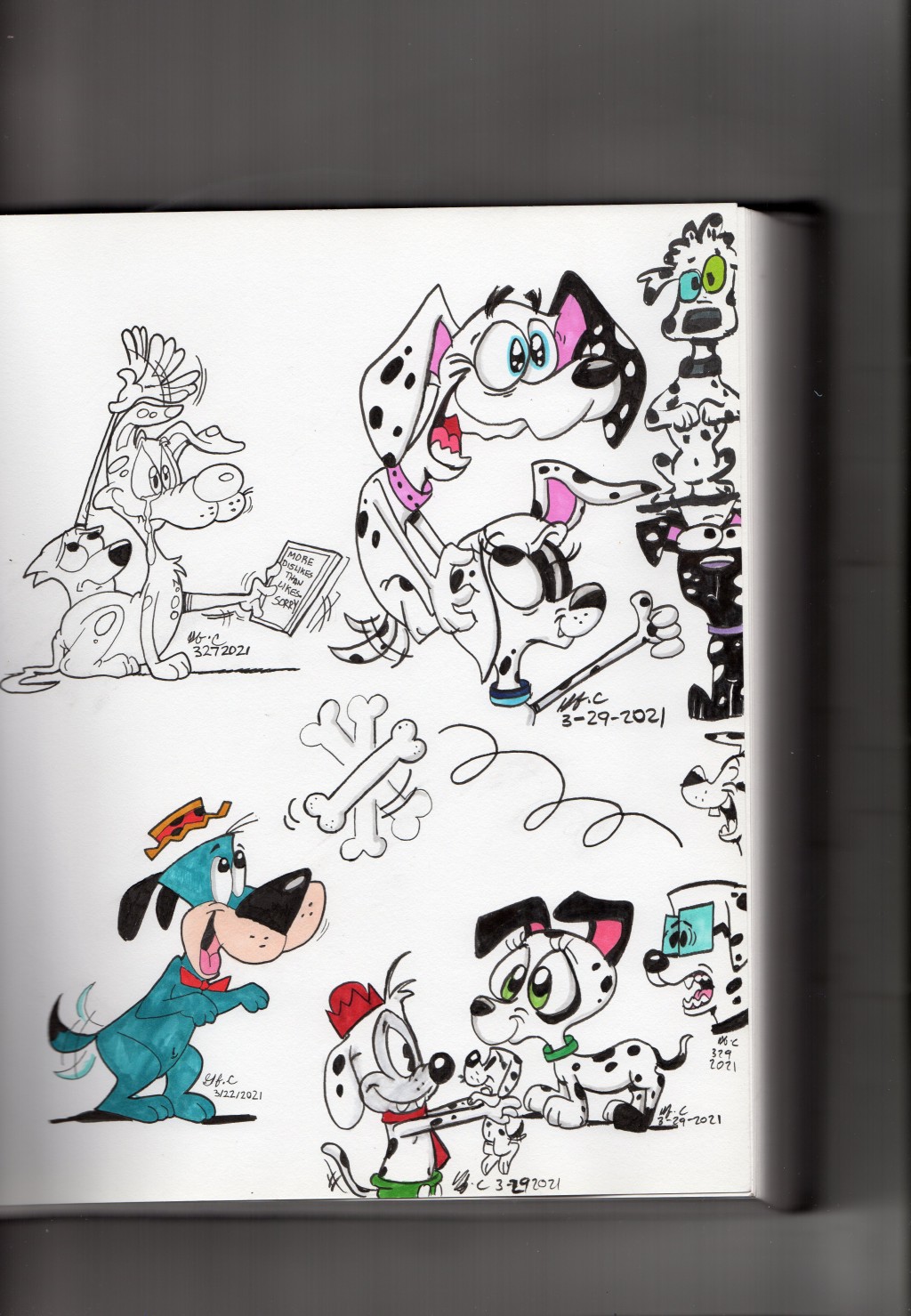 The first two doodles, the Huckleberry Hound and the social media dog are already on here. But I had more space on the paper, and decided to draw a bunch of dalmatian dogs after seeing "101 Dalmatian Street" on Disney XD, and my 1930's rubber hose dog Dipsy Diddle, whom I've done quite a bit of drawings of.