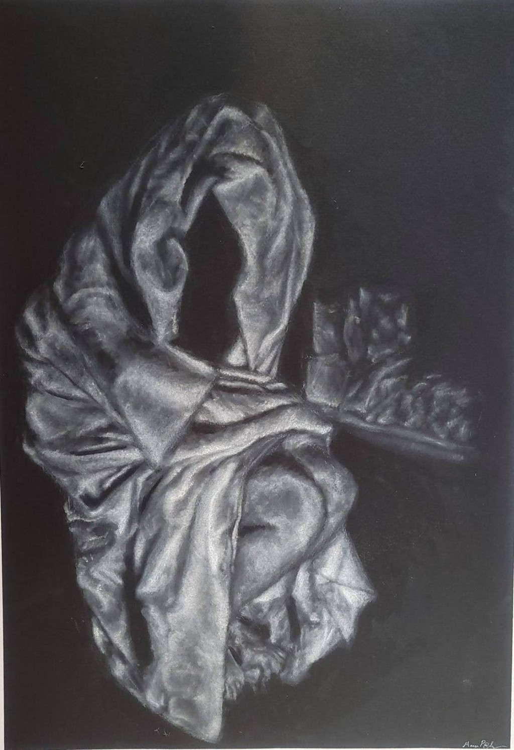 "To tempt someone into doing something or going somewhere, to draw in." 16x20 in, white charcoal and pastel on black paper.