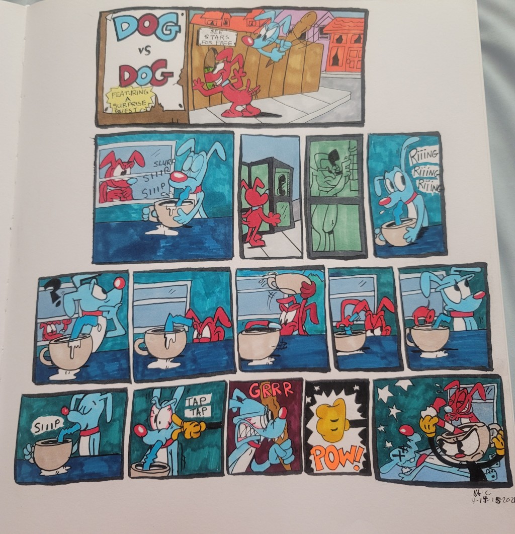 Every now and then, I do an homage to "Spy vs Spy" with a little something called "Dog vs Dog". It's a small short comic strip like series, that involves 2 dogs. One red, the other blue going at each others throats using various,violent' slapstick gags.