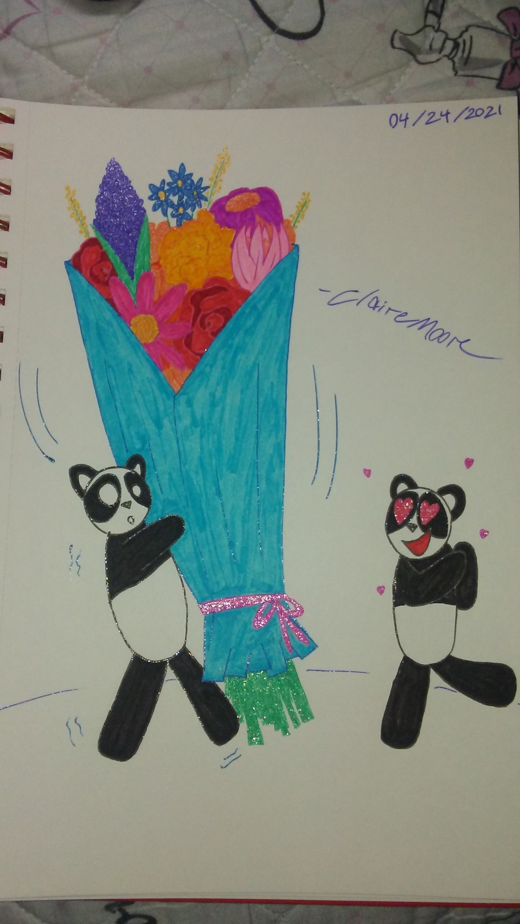 This is an adorable picture of a panda giving another panda a giant bouquet of flowers. The drawing was sketched with pencil, outlined with glitter pens, and mostly filled in with brush pens. Some details were filled in with the glitter pens also. Getting the flowers to look nice was not easy, but I think I just got away with it. Hope you enjoy the cute pair.