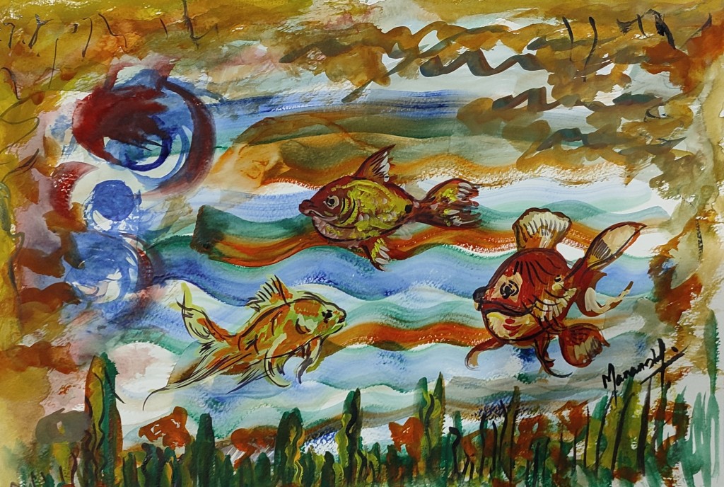 Wonderful watercolor! I really like how you painted the fishes. Colors immediately caught my eye. The painting is very dynamic. It feels like there is a storm in the aquarium.