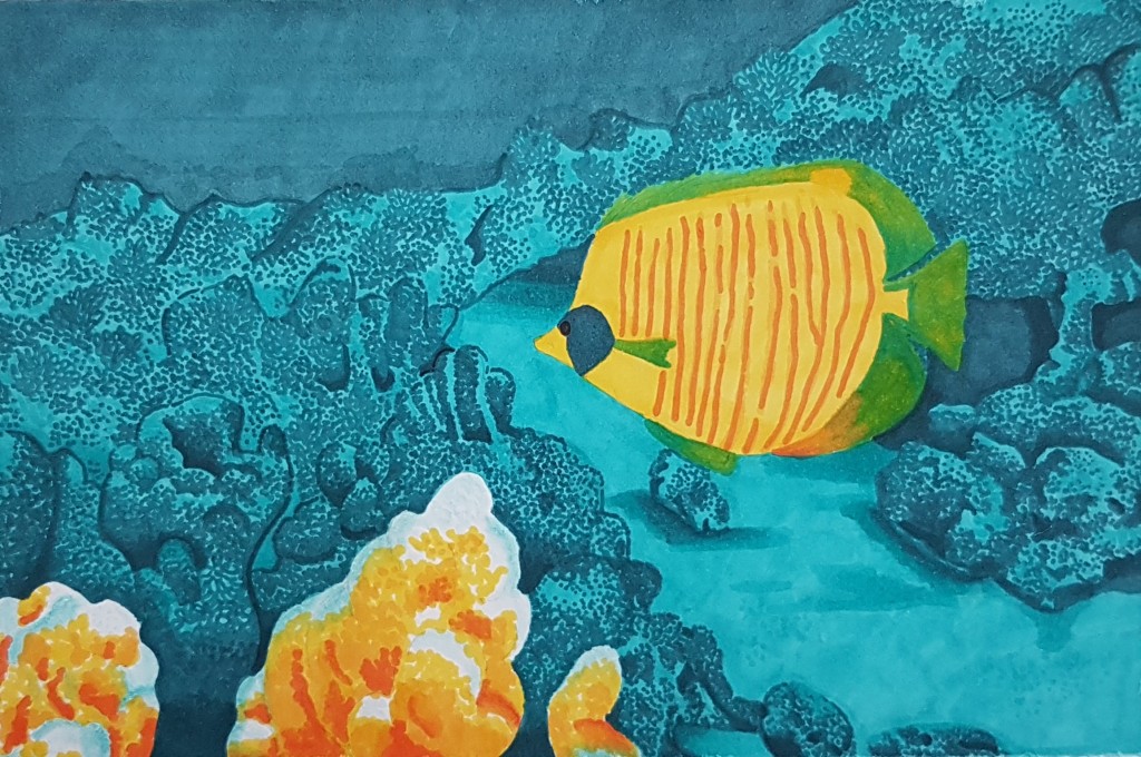 Mixed media piece. This is actually just one half. Watercolour, gouache, acrylic marker, coloured pencil and papercut.